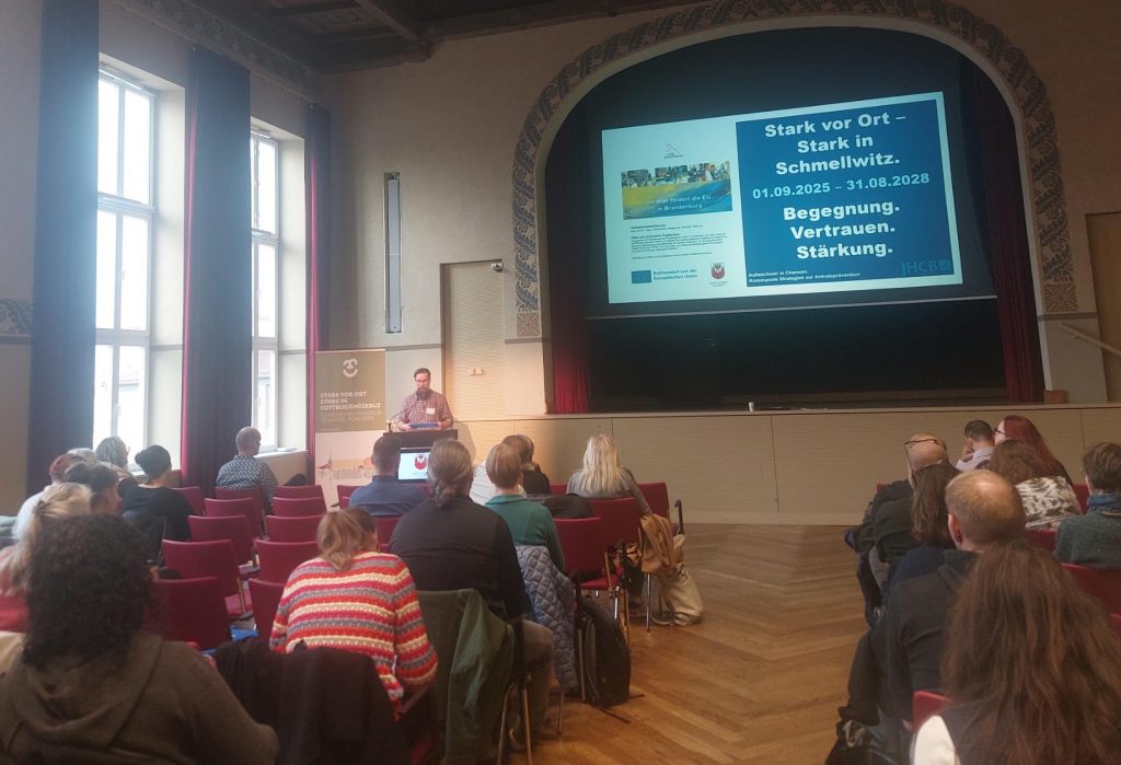 Der folgende Fachimpuls von Andreas Raab, Fachbereichsleiter für ambulante Hilfen zur Erziehung beim Träger Jugendhilfe Cottbus JHCB, vertiefte den Blick auf präventive Angebote im sozialen Nahraum, als er das „Modellprojekt Stark vor Ort – Stark in Schmellwitz. Begegnung. Vertrauen. Stärkung“ vorstellte.